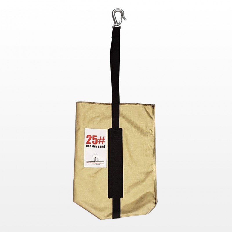 Counterweight sand bag with hook, 25 lb capacity. Made from 1000 Denier Cordura, reinforced with a sling, and equipped with a heavy metal hook and safety catch.