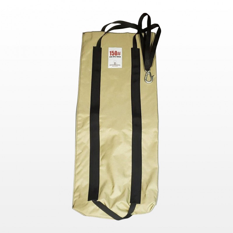 Counterweight sand bag with hook, 150 lb capacity. Made from 1000 Denier Cordura, reinforced with a sling, and equipped with a heavy metal hook and safety catch.