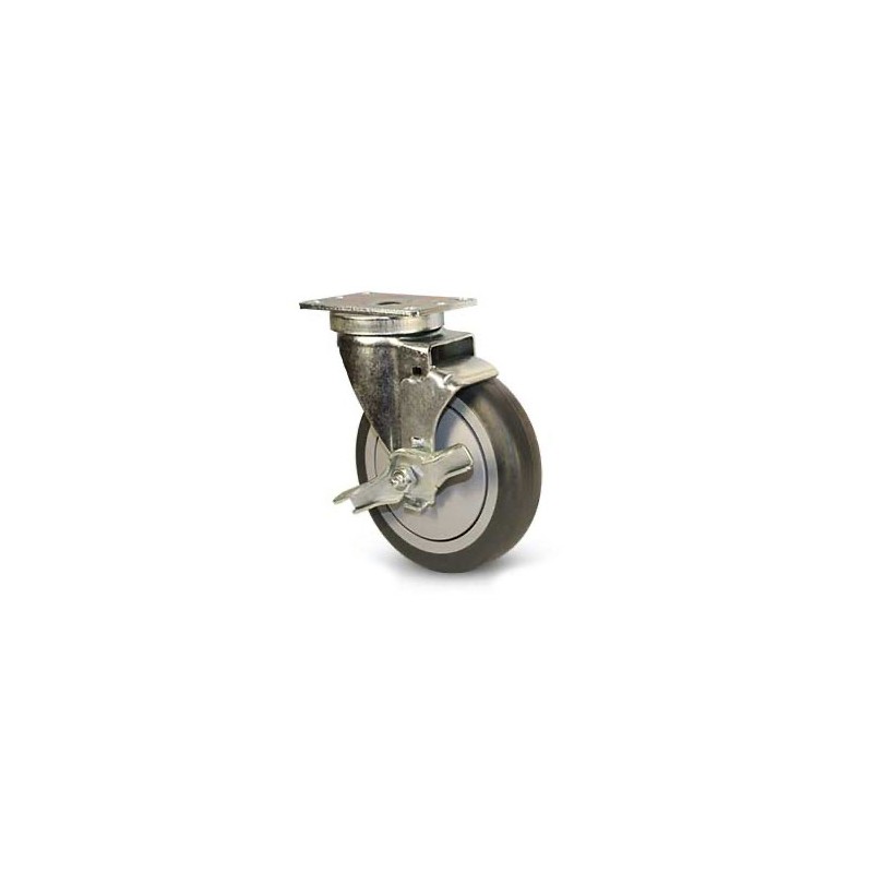Thermo-Pro Rubber Swivel caster w/ ball bearing and brake. 5" diameter wheels. Zinc finish. 300 lb capacity.